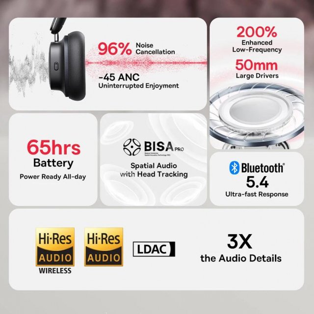 Experience a new level of listening with these ANC Wireless Over-Ear Headphones, designed for those who demand more from their music. Featuring advanced Active Noise Cancellation up to -45dB, these headphones effectively block out 96% of unwanted noise, creating an oasis of calm whether you’re commuting, studying, or relaxing. With Hi-Res LDAC audio decoding and BISA Pro Spatial Audio with head tracking, every note, beat, and whisper feels vividly real — like stepping into a concert hall made just for you.